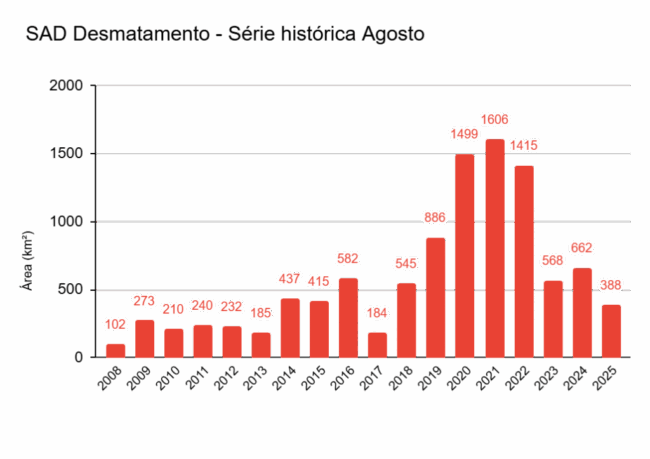 O levantamento do Sistema de Alerta do Desmatamento (SAD) também aponta que, entre janeiro e agosto de 2025, houve uma redução de 20% em relação ao mesmo período de 2024. Nos oito primeiros meses do ano, a Amazônia perdeu 2.014 km² de floresta — quase três vezes a área da cidade de Salvador, na Bahia.