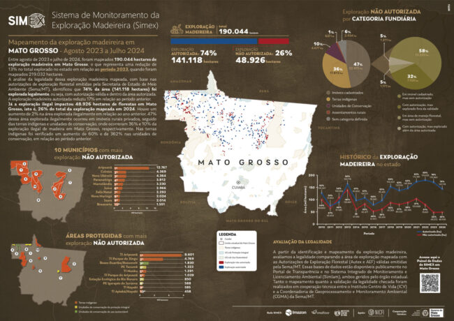 De acordo com a rede Simex, formada por ICV, Imazon e Imaflora, o estado também abriga 6 dos dez municípios brasileiros com mais exploração ilegal, sendo Aripuanã o primeiro do ranking, com 12,7 mil ha. Em seguida, aparecem Colniza (3º), Nova Ubiratã (4º), Paranatinga (6º), Marcelândia (7º) e Juína (9º).