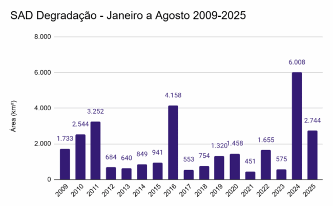 De janeiro a agosto, a área degradada na Amazônia Legal caiu de 6.008 km² em 2024 para 2.744 km² neste ano, uma redução de 54%. Mesmo com a queda, a extensão destruída ainda supera o tamanho da cidade de Palmas, capital do Tocantins.