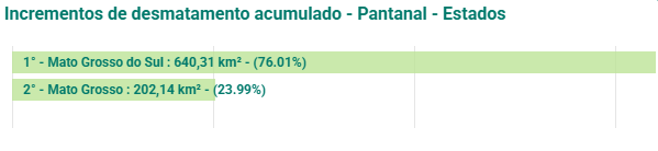 Mato Grosso do Sul concentrou 640,29 km², o equivalente a 76% da área desmatada no bioma no período, enquanto Mato Grosso respondeu por 202,15 km², ou 24% do total. Entre os municípios, Corumbá e Aquidauana lideraram a destruição, com 402,07 km² e 99,82 km² respectivamente. Somada, esta área corresponde a 60% do desmate.