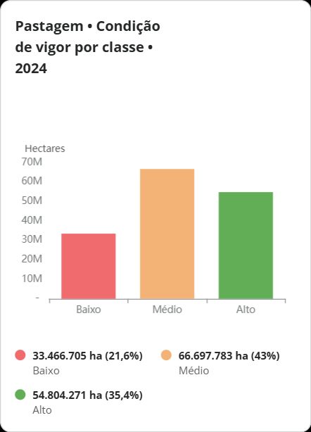 Entre 2000 e 2024, as pastagens registraram ganho líquido de vigor de 6,2 milhões de hectares. Nesse período, o vigor aumentou em 20,8 milhões de hectares e diminuiu em 14,6 milhões, enquanto 62 milhões de hectares permaneceram estáveis. Ao todo, 11,1 milhões de hectares evoluíram para a condição de alto vigor.