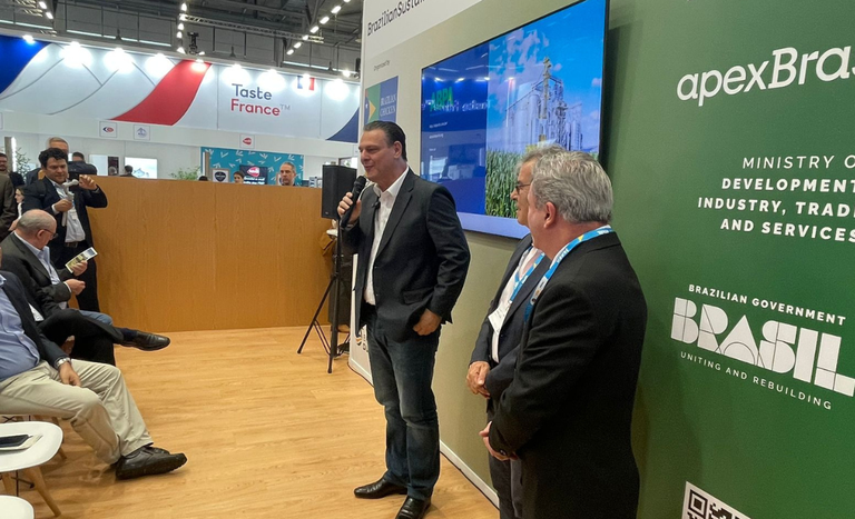 O evento aconteceu no estande da ABPA na Anuga – maior feira de alimentos do mundo – em Colônia, na Alemanha. Durante o lançamento, Fávaro lembrou a revolução promovida pelo Brasil na intensificação da produção de alimentos sem avançar nas áreas preservadas do país.